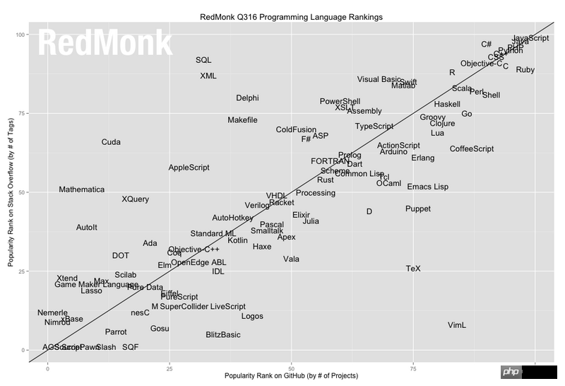 其实RedMonk综合Github(横轴)和StackOverflow(纵轴)的数据分析更符合Web开发者的看到的现状.比如2016年6月发布的编程语言排行榜,前4位是JS,Java,PHP,Python,另外C#,C++,Ruby并列第五,接下来是C和OC.