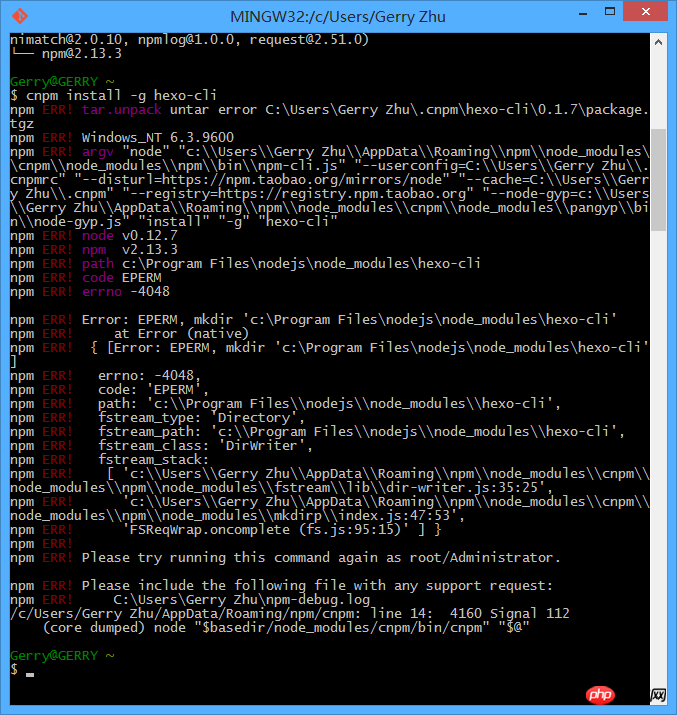 然后安装npm时cnpm install -g hexo-cli失败,错误信息如下:
