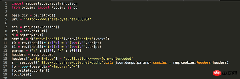 分析这个下载页面,发现点下载按钮的时候会向http://cdn.share-byte.net/d.php 这个URL去post,传递s和k两个值,这两个值可以通过正则匹配到,已经获得。
