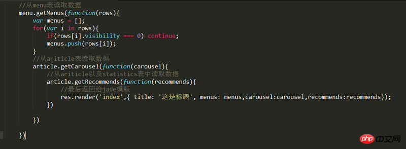 var getMenus = function() { return new Promise(function(resolve,reject){ //getMenus }): } var getCarousel = function() { return new Promise(function(resolve,reject){ //getCarousel }): } var getRecommends = function() { return new Promise(function(resolve,reject){ //getRecommends }): } Promise.all([getMenus,getCarousel ,getRecommends ]) .then(function(menus,carousel,recommends){ res.render('index,{xxx}) })