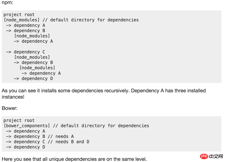 关键在于npm的依赖管理是奇特的倒向树结构(不同于linux越底层依赖越小)。一个普通的前端包的依赖树非常冗长,甚至可能触及windows下256字符的路径长度限制。同时和其它安装包不能共享依赖代码。导致文件非常多,不适合前端代码部署。而bower让模块开发者定义了简洁的输出文件。