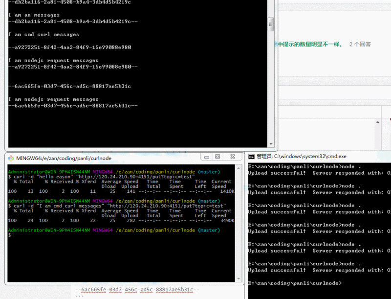 $ curl -d "I am cmd curl messages" "http://120.24.210.90:4151/put?topic=test"