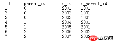 当id=4时,c_parent_id=2001,那么找到c_id=2001,其对应的id是1,所以id=4时对应parent_id=1.