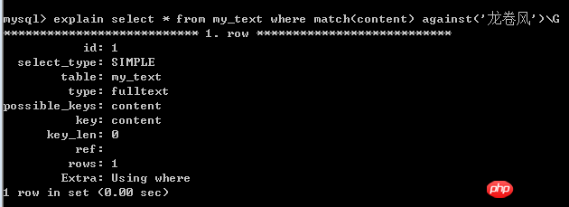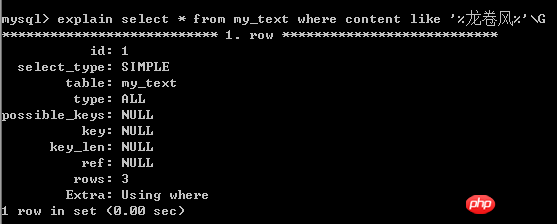 然后我使用like去匹配这篇文章,在解释器上却显示没有使用fulltext,依然使用全文扫文 full