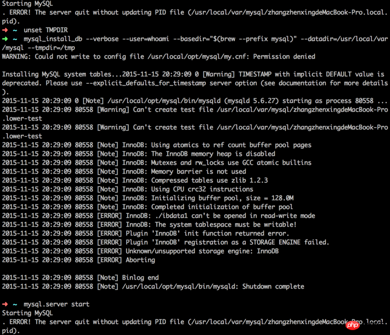 . ERROR! The server quit without updating PID file (/usr/local/var/mysql/zhangzhenxingdeMacBook-Pro.local.pid).