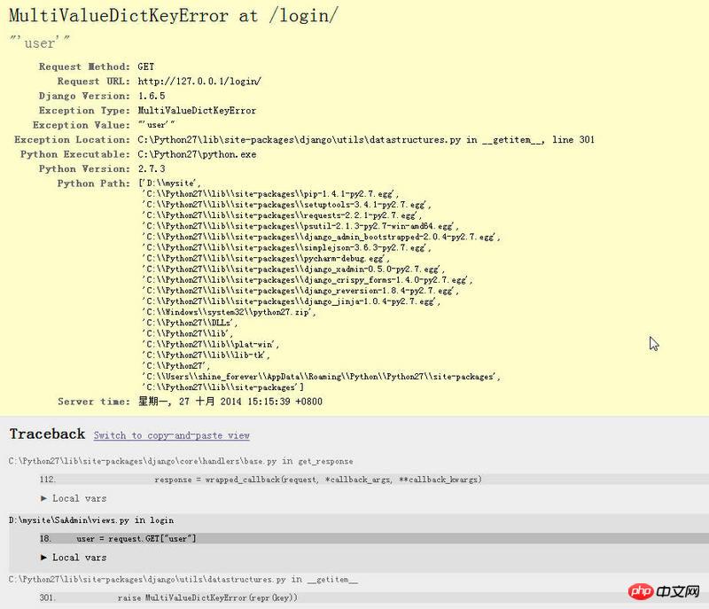 request.GET包含了所有GET请求的内容,看报错信息,大概是key出问题把提交的字段user 改掉,可能和自带的key