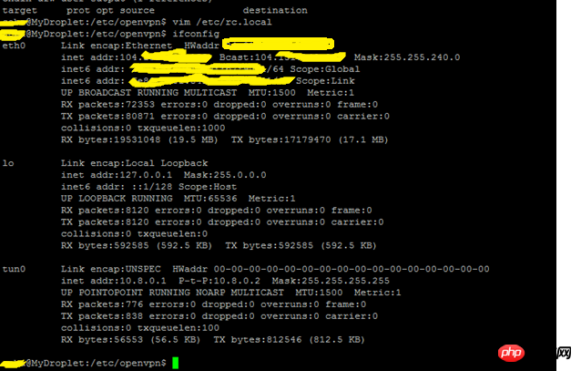 但是客户端无法通过浏览器上网,也ping 不通google,baidu,10.8.0.1。远程服务器ifconfig如下