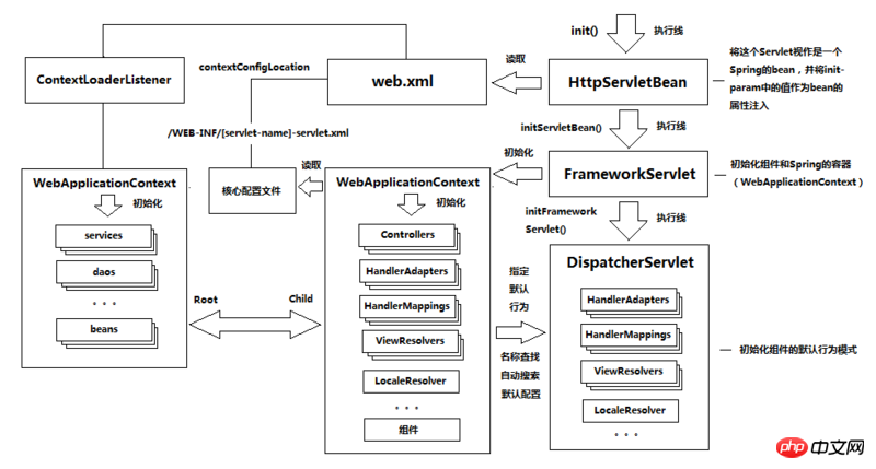 说起,一图胜千言:DispatcherServlet在初始化的时候会启动一个web容器,用户可以向这个web容器中注入相关的组件。一般而言,我们在web.xml这样配置ContextLoaderListener: