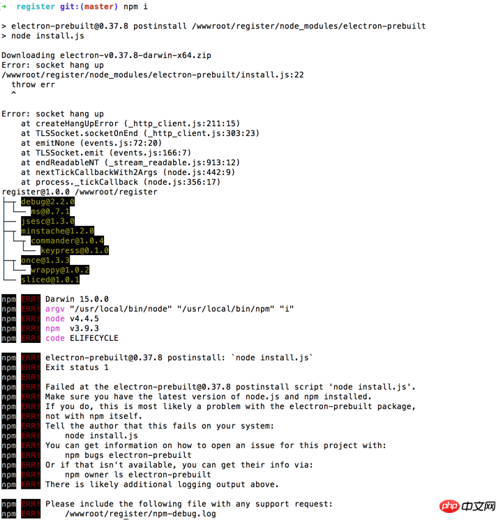 electron-prebuilt失败了,这个是在npm hooks里写的单独的脚本在下载,应该是地址被墙了。最简单的办法是挂