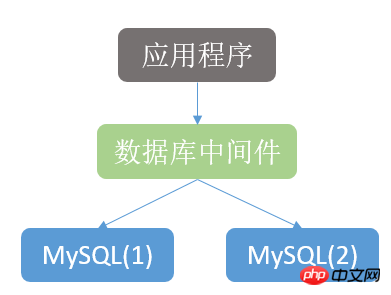 假设我有两个MySQL数据库节点,在这两个节点前面有一个数据库中间件,应用通过数据库中间件来使用后面的两个MySQL节点, 结构如下图所示: