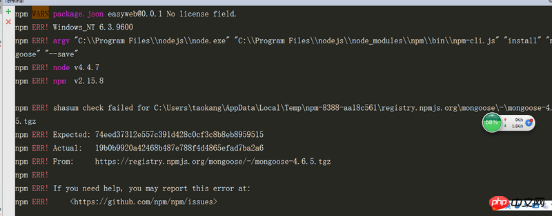 在webstorm中的terminal中用npm install mongoose --save下载mongoose,报错,求大神解决一下