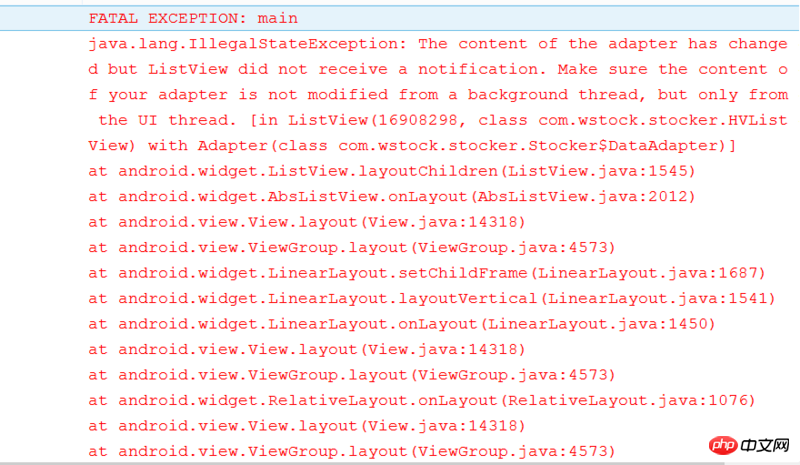 找不到你更新数据的代码。看Log,原因是你在非UI Thread对数据源进行了操作。而你的 handleMessage() 只看到了 notifyDataSetChanged()。那么在你更新数据源和 notifyDataSetChanged() 之间,就留出了空隙引发错误。