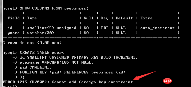 这几天刚开始学mysql,今天学习外键,但是确保了以下错误,在网上找了一些方法,,但还是没用,希望大家帮忙解决下,.]