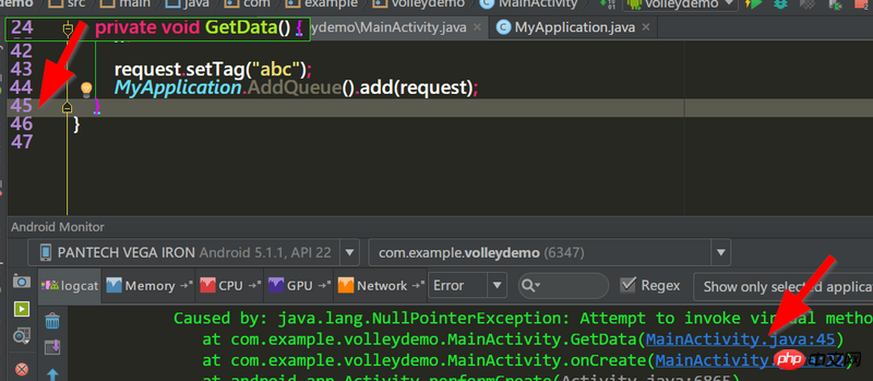 at com.example.volleydemo.MainActivity.GetData(MainActivity.java:45)