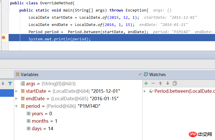 这个Period对象里封装了两个LocalDate之间的一些时间数据,这个结果表示,当前这两个时间相差1个月零14天的