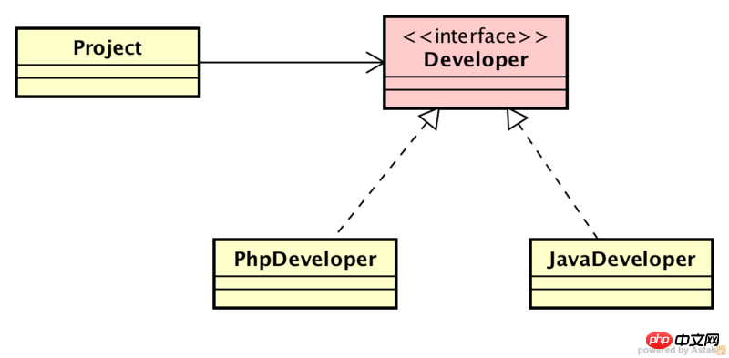 通过 Developer 接口实现的「控制反转」,Project 和 PhpDeveloper 都信赖于 Developer Interface