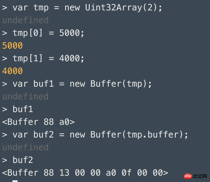 3.这个不清楚,只能说现象了,buf1输出了申请空间的首字节的数据,buf2输出了申请空间的所有字节的数据.我这里使用了Uint32Array()的结果可以说明。