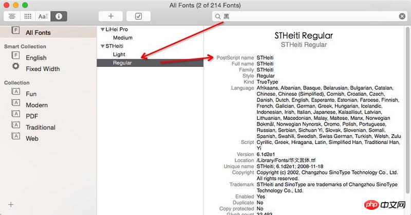 字体这么找,打开fontbook,然后搜索字体,找到字体之后点击info,看字体的信息,iOS的fontWithName是通过PostScriptName来查找的。