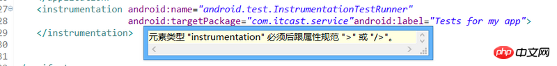 还有我检查过代码  没有缺少标签,单标签和双标签instrumentation这里都会提示图片上那个样子的错误。这是为什么?