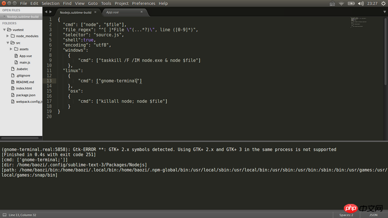 我就是在ubuntu中安装了一个sublime3,sublime3安装的了nodejs插件。我想在按ctrl+b的时候,在当前目录 打开一个shell。但是现在报错