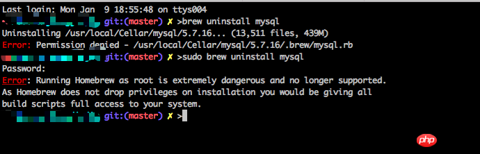 sudo chmod -R 777 /usr/local/Cellar/mysql/5.7.16 brew uninstall mysql