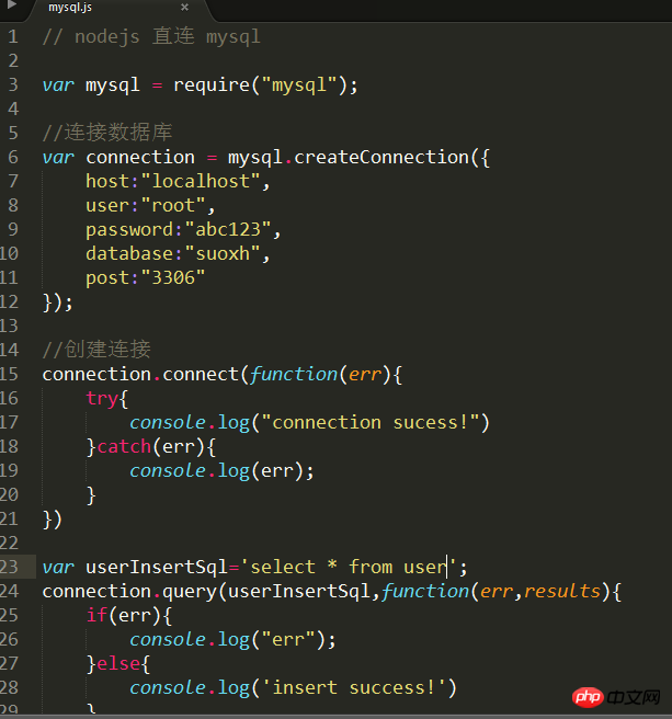 数据库名:suoxh,表格名:user为什么已经连接成功,结束成功,但是写入node指令连接操作不了,中间代码不对吗?老是日志打印err;换了其他指令比如插入数据等也不行求各路大神指点啊,搞了一晚上了,查不出来啊