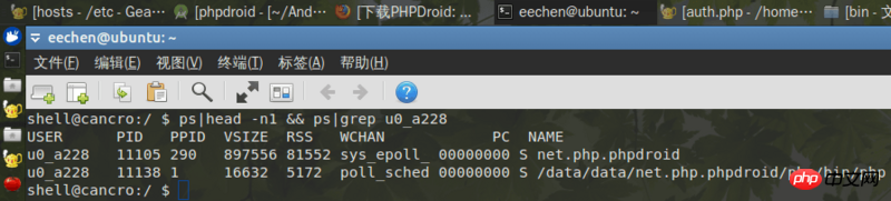 USER PID PPID VSIZE RSS WCHAN PC NAME u0_a228 18922 290 964616 121072 sys_epoll_ 00000000 S net.php.phpdroid u0_a228 5113 1 16632 4040 pipe_wait 00000000 S /data/data/net.php.phpdroid/php/bin/php u0_a228 29176 5113 2732 1188 sys_rt_sig 00000000 S sh u0_a228 29195 29176 2556 1012 00000000 R ps u0_a228 29196 29176 1256 4 pipe_wait 00000000 S ./busybox