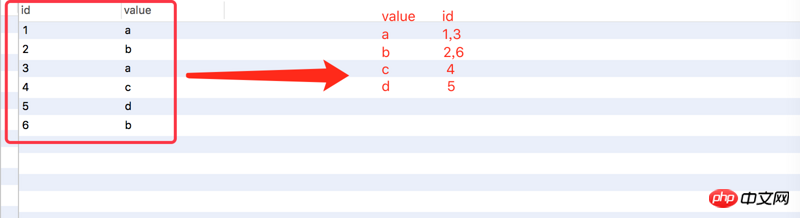 SELECT value, group_concat(id) FROM tablename GROUP BY value;