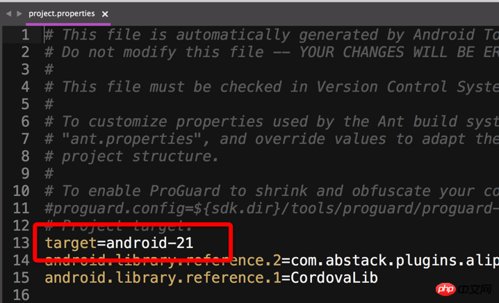修改android 的 target 版本,不一定要按照我的截图来,你需要根据你实际安装的sdk api 版本来指定。因为我是使用 android studio 修改 project.properties 会自动刷新整个项目.在 project.properties 里面有这样一段话: