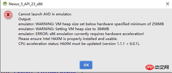 你新建了一个x86的虚拟机,需要硬件加速的支持,改用arm的不就好了,或更新HAXM到最新版本https://software.intel.com/en-us/android/articles/intel-hardware-accelerated-execution-manager