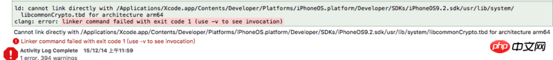 ld: cannot link directly with /Applications/Xcode.app/Contents/Developer/Platforms/iPhoneOS.platform/Developer/SDKs/iPhoneOS9.2.sdk/usr/lib/system/libcommonCrypto.tbd for architecture arm64
