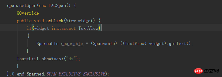 span.setSpan(new ClickableSpan() { @Override public void onClick(View widget) { String spanString = ((TextView)widget).getText().toString().substring(0, end); } }, 0, end, Spanned.SPAN_EXCLUSIVE_EXCLUSIVE);