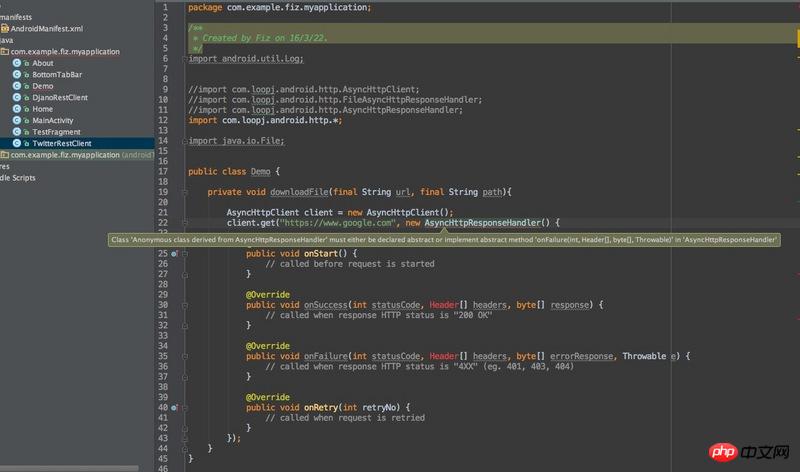 正在学习android-async-http 这个库,我把官网的代码拷了过来想测试一些就报错,麻烦给看看哪里有问题了啊?新手不懂