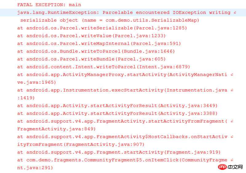 07-12 12:51:58.093: E/AndroidRuntime(12270): java.lang.RuntimeException: Parcelable encountered IOException writing serializable object (name = XXX.SerializableMap)XXX