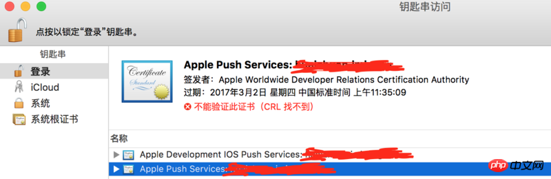 描述你的问题钥匙串中的推送证书显示不能验证此证书(CRL)找不到了,但是企业证书就很正常