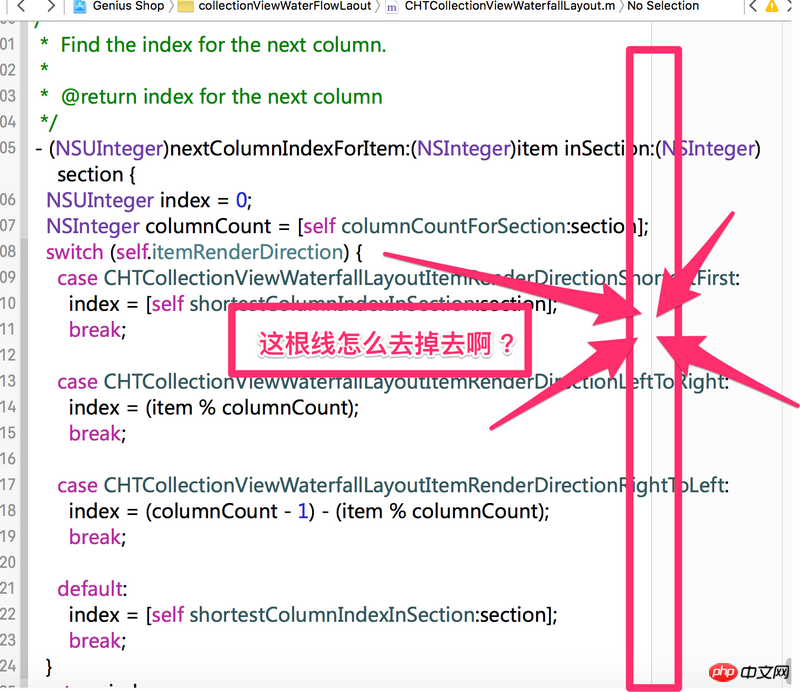 这里是Xcode编辑器,请问右边那一根竖直方向上的线怎么隐藏或者去掉去啊????...有会的老司机吗,顺带指点一下呗