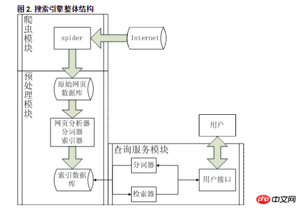 爬虫从 Internet 中爬取众多的网页作为原始网页库存储于本地,然后网页分析器抽取网页中的主题内容交给分词器进行分词,得到的结果用索引器建立正排和倒排索引,这样就得到了索引数据库,用户查询时,在通过分词器切割输入的查询词组并通过检索器在索引数据库中进行查询,得到的结果返回给用户。