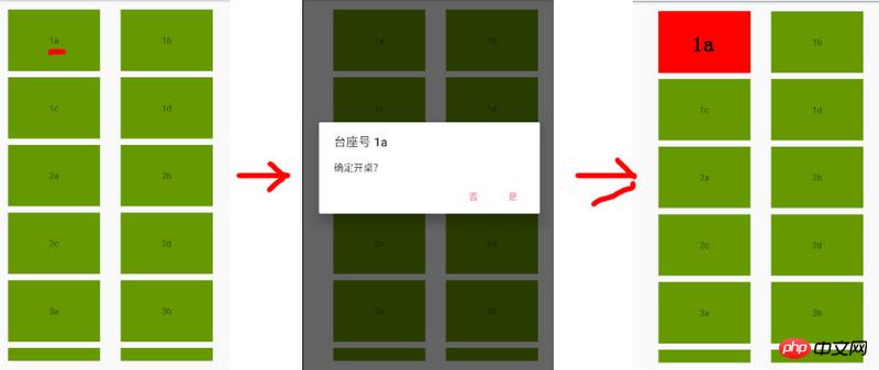 默认情况下,每个桌子都是绿色背景。 如果点击该item, 会出现一个Dialog 窗口;提示是否开桌子。 如果点击是,该item的背景颜色更换为红色。