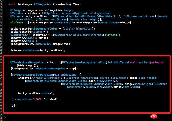 现在出现了一个问题,那就是,当我调用这个放大类以后,动画展示backgroundView出来的一瞬间又消失了,我在这段代码下面的部分写了控制消失的手势,就是tap那里,但是需要一个手势才会消失,断点查看并没有通过这段控制消失的代码,那么现在这个动画后backgroundView出现瞬间消失的问题是出在哪里呢?