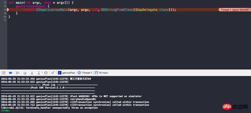 項目里是不是引用了第三方的收集 crash log 的功能? 比如友盟之類的?如果是的話, 在 debug 模式時,關閉該功能試試。