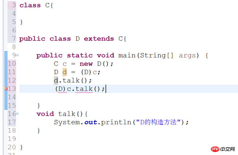 有两个错误,首先你需要把C定义为抽象类,或是将talk定义在C中,然后在D类重写;还有就是c的转换应该为((D)c).talk()才对。