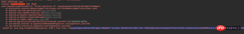 Caused by: java.lang.ClassNotFoundException: Didn't find class "com.growingio.android.sdk.agent.VdsAgent" on path: DexPathList[[dex file "/data/data/com.dituwuyou/files/instant-run/dex/slice-weiboSDKCore_3.1.4_3da283
