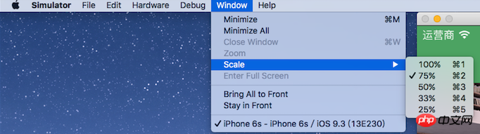 点击模拟器,顶部菜单会切换到模拟器的相关选项菜单 -> Window -> Scale -> 选择百分比