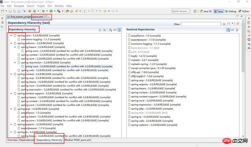1.maven项目中pom.xml文件的dependency hierarchy 即依赖的jar包结构图,很显然缩进的jar包是上一行jar包的子包,这些在解决jar包的冲突的时候是非常关键的。