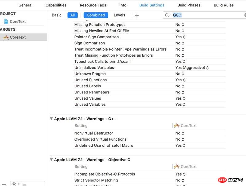 在Target->Build Settings->搜索GCC(搜索框左边记得选All)