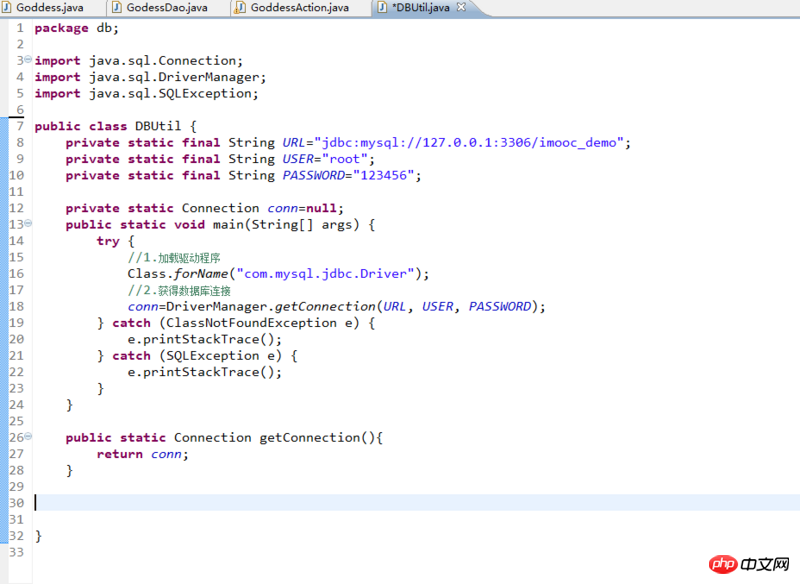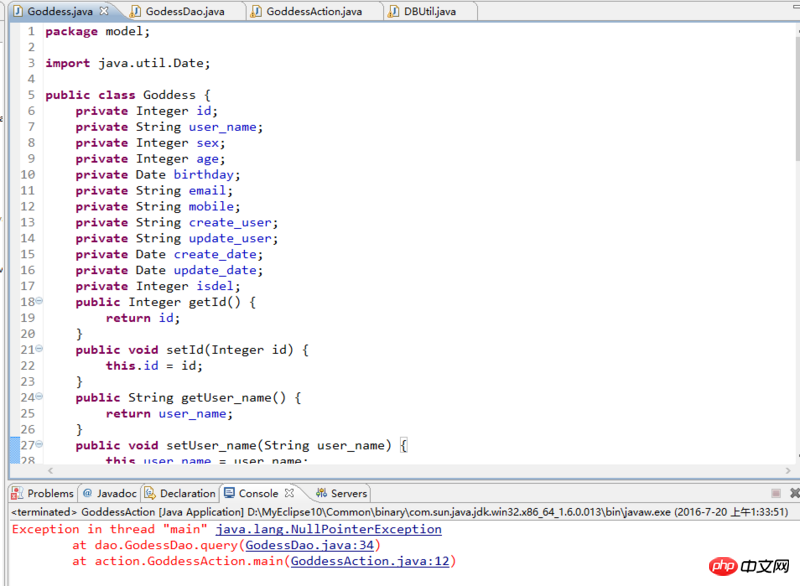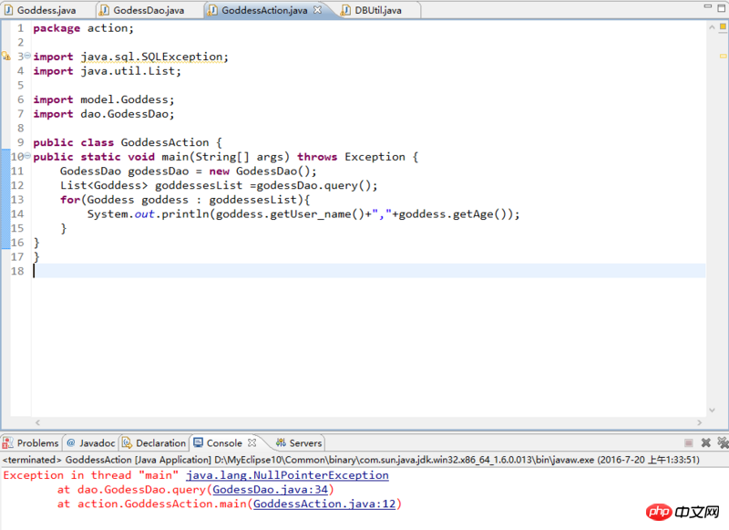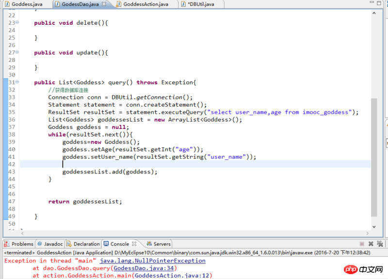 DBUtil.getConnection() 里 return conn,你看看你的 conn 初始值是啥?从你 console 里的显示看你的入口是 GoddessAction.main 方法, 压根就没看到上面的截图里有调用 DBUtil.main ,你当 main 是构造方法呢?
