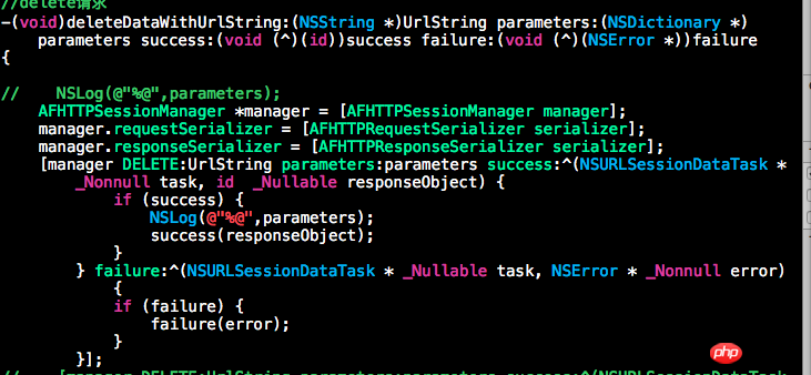 AFHTTPRequestSerializer里的HTTPMethodsEncodingParametersInURI这个值里有没有"DELETE"。服务端返回的应该是JSON吧,把下面这两行去掉。