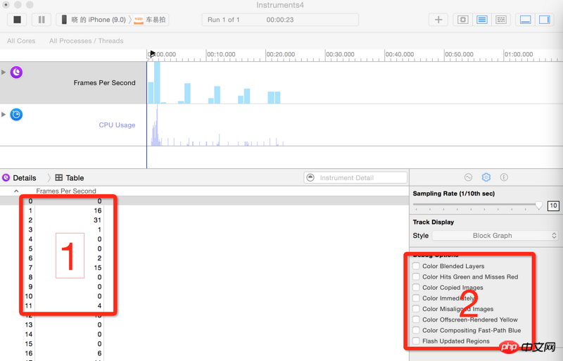 为什么比较卡顿的情况下 frames per seond(红框1区域) 显示值还是很大。我快速滑动的时候,红框1的frames per second的值一直是50左右。而我用GT工具分析和实际的操作体验下滑动collectionViewCell很卡顿?