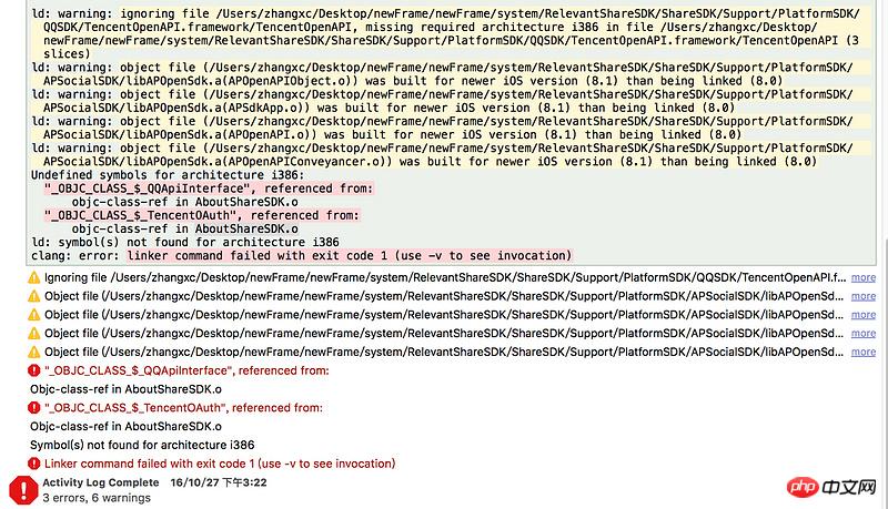 报错信息可以看出 i386 表示这个SDK打包的时候不支持当前模拟器,你可以通过终端命令查看lipo -info shareSDK.o是否支持armv7、arm64,如果支持就不用担心,真机是没问题的。