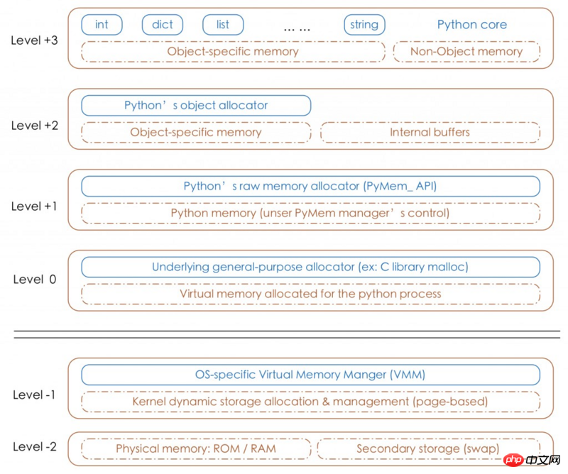 Python的垃圾回收采用的引用计数的办法, 引用计数的原理可以自己从网上找.以下的python分配器的层级